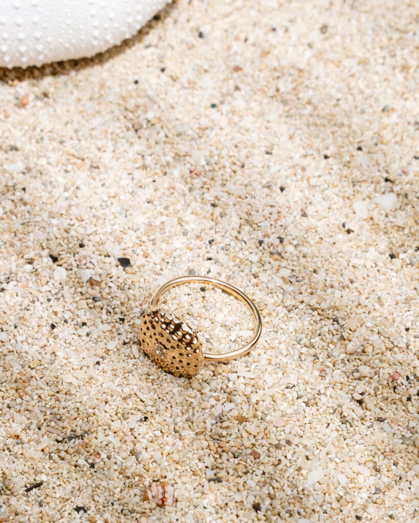 Inspirée par la beauté singulière de l’oursin, la bague Caribbean Vibes capture l’essence des fonds marins : mystérieuse, graphique, naturellement précieuse.